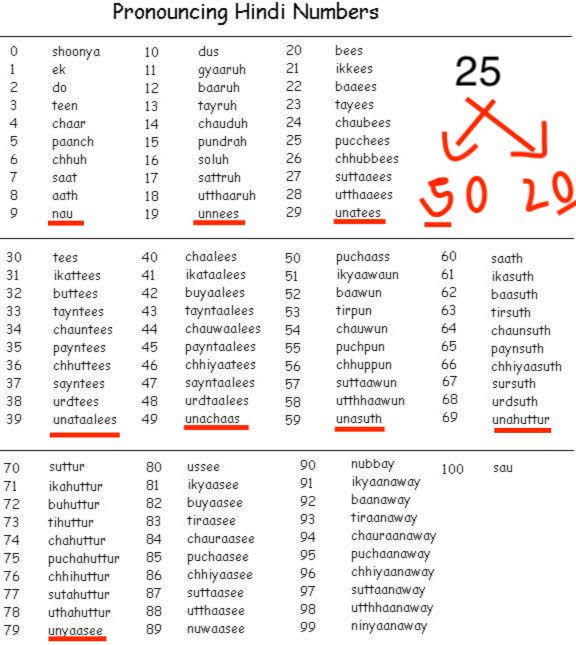 learn Hindi numbering instantly if you know 0 to 9 and then multiples of 10. The underlined words